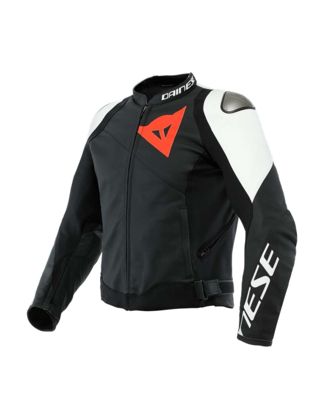 Giacca moto Dainese Sportiva, realizzata in pelle bovina Tutu morbida e resistente, con protezioni interne Pro-Armor certificate secondo la norma EN 1621.1, che garantiscono massima capacità protettiva, e al tempo stesso flessibilità e libertà di movimento, perché ventilate per oltre il 40% della superficie. Alla protezione interna sulle spalle sono abbinate esternamente delle placche in alluminio intercambiabili: una tecnologia distintiva di Dainese progettata per favorire lo scivolamento in caso di caduta ed evitare il rischio di rotolamento sull'asfalto. Per favorire ulteriormente flessibilità e comfort alla guida, la struttura in pelle presenta inserti in tessuto bielastico S1 su fianchi e interno braccia e tecnologia Microelastic posizionate sulla schiena per aumentare la libertà di movimento. La Giacca Sportiva Dainese è dotata di tasca posteriore per inserire in paraschiena, regolazione del fit sui fianchi con velcro e due prese d’aria laterali che, in caso di aumento della temperatura, aiutano e ristabilire la freschezza ottimale, supportata anche dalla presenza di una fodera interna traspirante Nanofeel® con trattamento agli ioni d'argento.